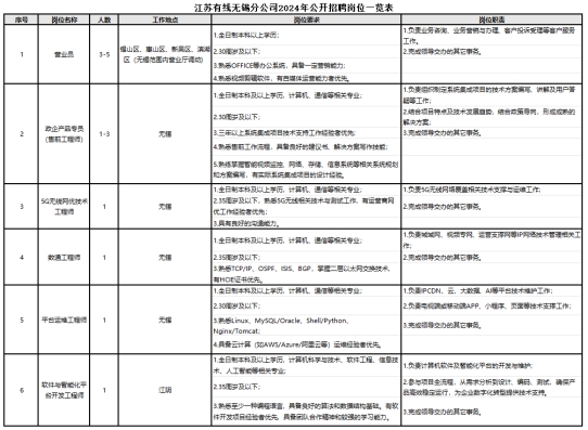 為進(jìn)一步優(yōu)化江蘇有線無(wú)錫分公司人才隊(duì)伍結(jié)構(gòu),深入推進(jìn)經(jīng)濟(jì)社會(huì)高質(zhì)量發(fā)展,江蘇有線無(wú)錫分公司決定面向社會(huì)公開招聘8-12名工作人員。具體如下: