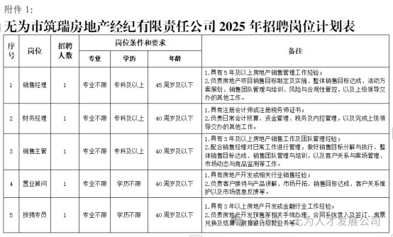 詳見《無為市筑瑞房地產(chǎn)經(jīng)紀有限責任公司2025年招聘崗位計劃表》(附件1)