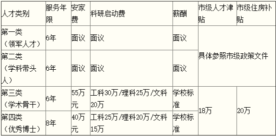 2.第一類及第二類人才采用年薪制,第三類及第四類人才根據(jù)學(xué)校標(biāo)準(zhǔn)取薪(詳見待遇表);
