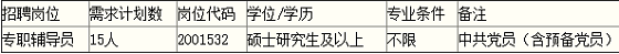 本次專職輔導(dǎo)員招聘計(jì)劃為15人,全部納入學(xué)校正式事業(yè)編制,具體招聘計(jì)劃如下:
