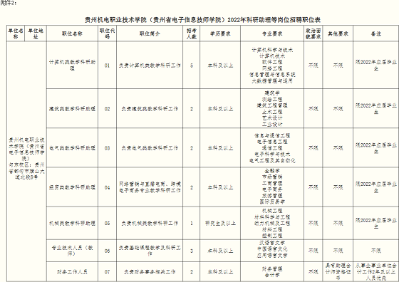 本次面向社會公開招聘編制外工作人員17人,其中科研助理12人(限2022年應(yīng)屆畢業(yè)生),其他崗位5人。具體招聘崗位及要求詳見《貴州機電職業(yè)技術(shù)學(xué)院(貴州省電子信息技師學(xué)院)2022年科研助理崗位招聘職位表》(附件2)。