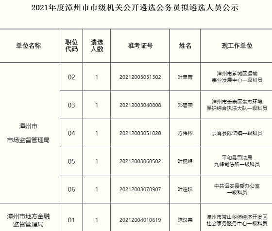 根據(jù)《2021年度漳州市市級機關(guān)公開遴選公務(wù)員公告》要求,經(jīng)筆試、面試、考察、體檢等遴選程序,經(jīng)研究確定葉聿菁等6位同志為擬遴選人員,現(xiàn)予以公示。公示期間,歡迎群眾來電、來信、來訪反映情況。
