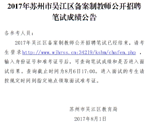 2017年蘇州市吳江區(qū)備案制教師公開招聘筆試成績(jī)公告