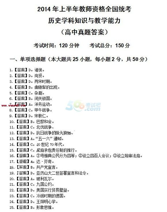 2014上半年教師資格考試《高中歷史學(xué)科知識與教學(xué)能力》真題答案