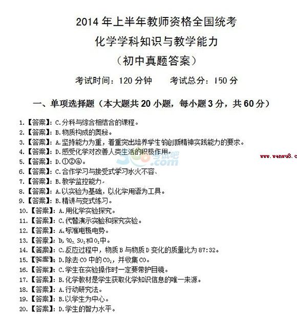 2014上半年教師資格考試《初中化學(xué)學(xué)科知識(shí)與教學(xué)能力》真題答案