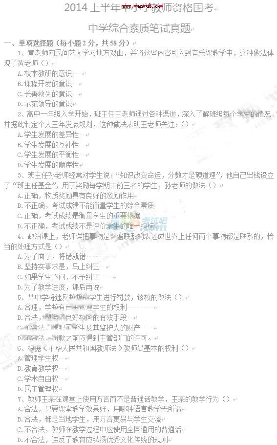 2014年上半年教師資格考試《中學綜合素質(zhì)》真題及答案