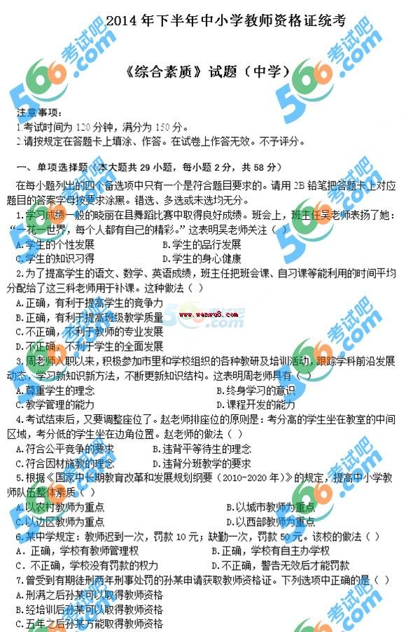 2014下半年教師資格證考試《中學綜合素質》真題(完整版)