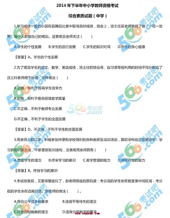 2014下半年全國統(tǒng)考教師資格證考試《中學(xué)綜合素質(zhì)》真題及答案