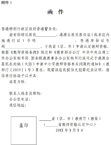 港澳臺(tái)居民申請(qǐng)認(rèn)定中小學(xué)教師資格需提供無犯罪記錄證明。無犯罪記錄證明由申請(qǐng)人自行到香港特別行政區(qū)、澳門特別行政區(qū)和臺(tái)灣地區(qū)的有關(guān)部門開具。香港特別行政區(qū)、澳門特別行政區(qū)申請(qǐng)人開具無犯罪記錄證明所需的《無犯罪記錄證明函件》(附件1、2),由申請(qǐng)人填寫后交給現(xiàn)場確認(rèn)點(diǎn),待函件辦理完畢后,由申請(qǐng)人到認(rèn)定機(jī)構(gòu)領(lǐng)取。