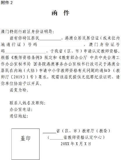 港澳臺(tái)申請(qǐng)人員開具無犯罪證明需要內(nèi)地提供函件的,各認(rèn)定機(jī)構(gòu)在網(wǎng)報(bào)結(jié)束后的5個(gè)工作日內(nèi),將本機(jī)構(gòu)港澳臺(tái)申請(qǐng)人的姓名、港澳臺(tái)居民居住證(或來往內(nèi)地通行證)號(hào)碼和香港(澳門、臺(tái)灣)身份證號(hào)碼信息匯總后報(bào)省教師繼續(xù)教育指導(dǎo)中心。