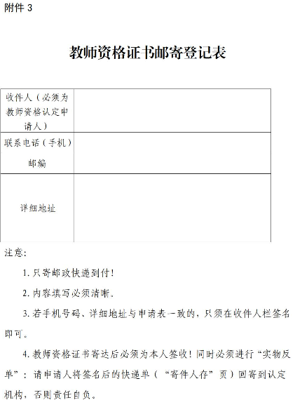 (3)若申請(qǐng)人不能親自到現(xiàn)場領(lǐng)取證書和《申請(qǐng)表》的,還須附上委托書,由代理人代領(lǐng)取。若需郵寄送達(dá)證書和《申請(qǐng)書》的,需提前填寫好《教師資格證書及教師資格認(rèn)定申請(qǐng)表郵寄登記表》(附件3),待現(xiàn)場審核時(shí)提交登記表,郵費(fèi)到付,本人簽收,并將簽名后的快遞單回寄認(rèn)定機(jī)構(gòu)。全日制非師范教育類應(yīng)屆畢業(yè)生須畢業(yè)后憑本人身份證和學(xué)歷證書到認(rèn)定機(jī)構(gòu)領(lǐng)取《教師資格證》和《教師資格認(rèn)定申請(qǐng)表》各一份(《教師資格認(rèn)定申請(qǐng)表》須由申請(qǐng)人遞交給本人人事檔案所在的管理部門,歸入本人人事檔案,遺失責(zé)任自負(fù))。