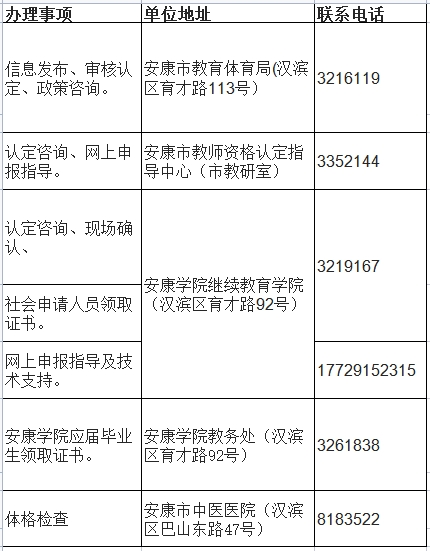 3.安康市教師資格認(rèn)定機(jī)構(gòu)聯(lián)系方式及信息發(fā)布網(wǎng)址:http://jyj.ankang.gov.cn/。