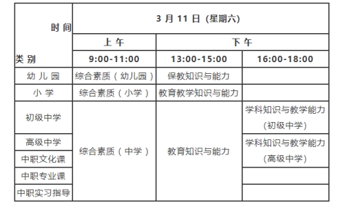 答:全國(guó)統(tǒng)一考試日期2023年3月11日,各類別考試科目與時(shí)間安排如下: