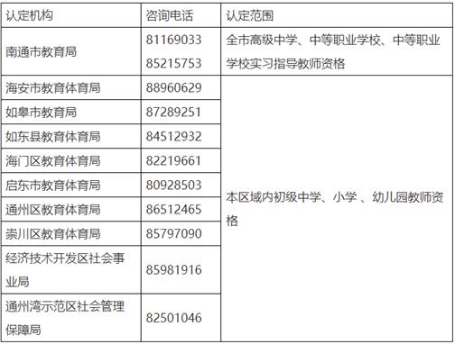 幼兒園、小學(xué)和初級中學(xué)教師資格,由各縣(市、區(qū))教育局認(rèn)定,請關(guān)注各縣(市、區(qū))教育局公告。咨詢電話如下: