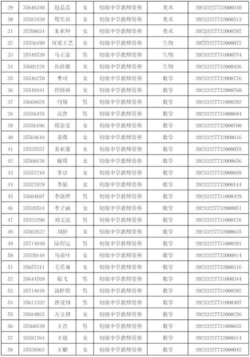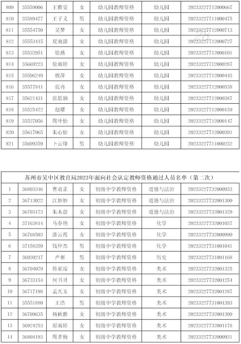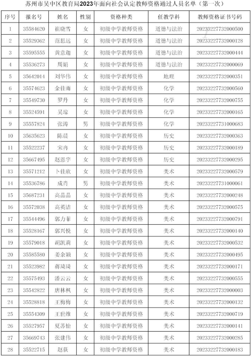 根據(jù)省、市教師資格認定工作的要求,按照網(wǎng)上申請、體格檢查、現(xiàn)場確認、違法犯罪記錄核查等程序,經(jīng)審定,2023年第一、二次共1408人通過資格認定,F(xiàn)將認定結(jié)果予以公示(見附件1),公示時間為2023年7月17日至2023年7月21日。如有異議,可在公示期內(nèi)向蘇州市吳中區(qū)教育局人事與教師工作科反映,聯(lián)系電話:0512-67081181。