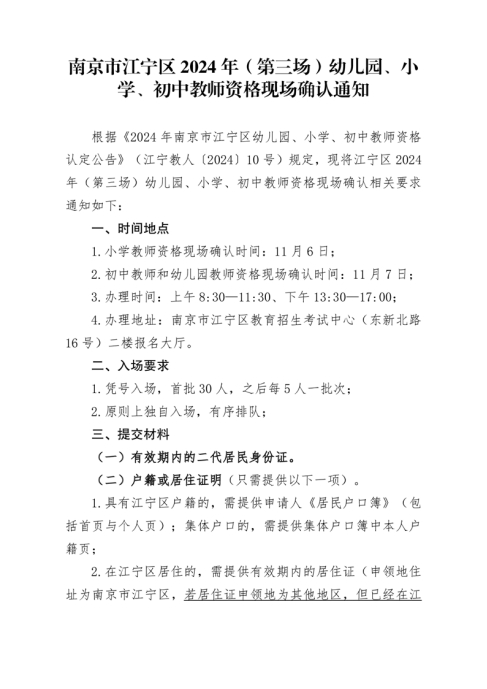 2024年南京市江寧區(qū)(第三場(chǎng))幼兒園、小學(xué)、初中教師資格現(xiàn)場(chǎng)確認(rèn)通知