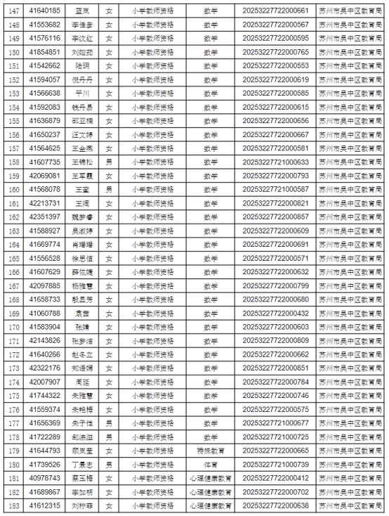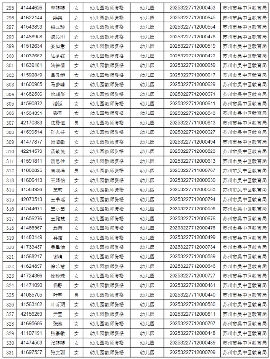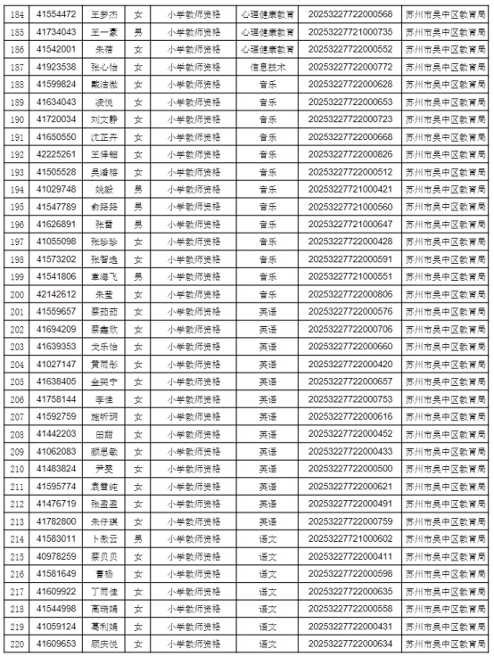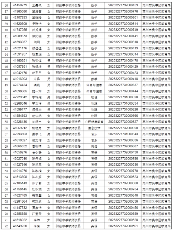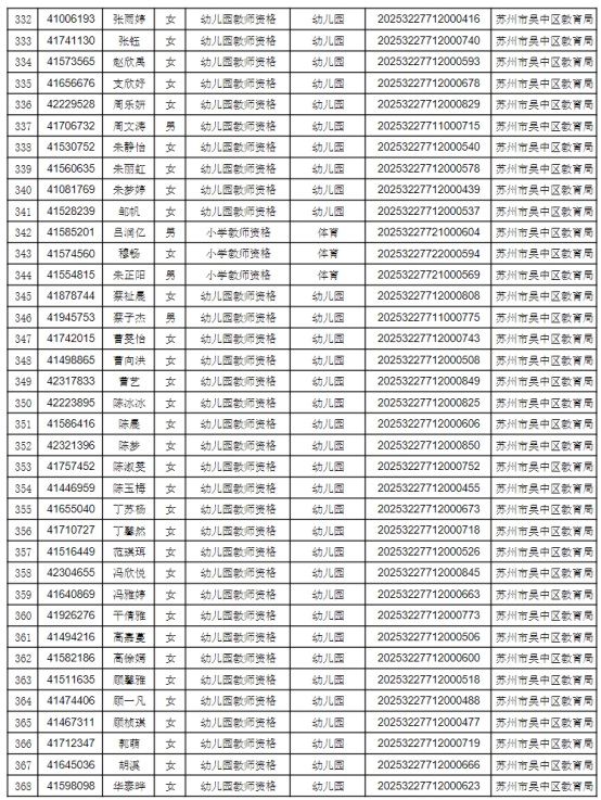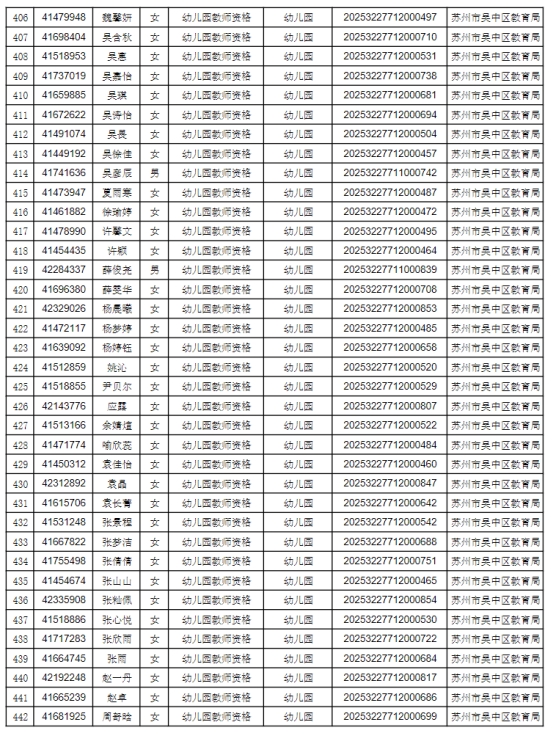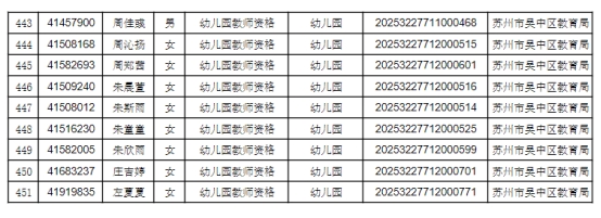 根據(jù)省、市教師資格認(rèn)定工作的要求,按照網(wǎng)上申請(qǐng)、體格檢查、現(xiàn)場(chǎng)確認(rèn)、違法犯罪記錄核查等程序,經(jīng)審定,2025年第二次共451人通過資格認(rèn)定,F(xiàn)將認(rèn)定結(jié)果予以公示(見附件1),公示時(shí)間為2025年7月21日至2025年7月25日。如有異議,可在公示期內(nèi)向蘇州市吳中區(qū)教育局人事與教師工作科反映,聯(lián)系電話:0512-67081181。