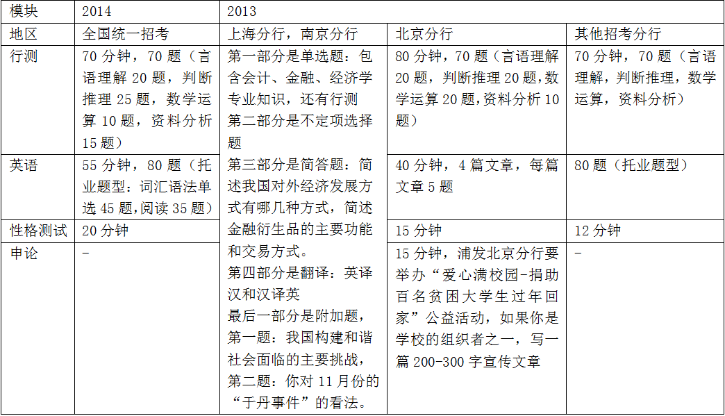2013-2014年浦發(fā)銀行校園招聘考試題型科目分析