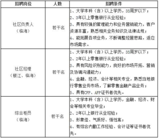 現(xiàn)因業(yè)務(wù)發(fā)展需要,溫州銀行臺(tái)州分行現(xiàn)誠邀業(yè)內(nèi)金融優(yōu)秀人才加盟,攜手共創(chuàng)成功事業(yè)。