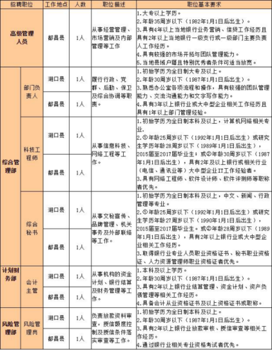 經(jīng)中國銀行業(yè)監(jiān)督管理委員會批準規(guī)劃,九江銀行將在湖口、都昌地區(qū)主發(fā)起設(shè)立村鎮(zhèn)銀行,現(xiàn)誠邀有志于金融事業(yè)的優(yōu)秀人才加入,我們將為您提供具有競爭力的薪酬待遇、廣闊的職業(yè)發(fā)展空間和卓越向前的企業(yè)文化,與您共創(chuàng)美好未來!