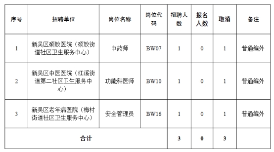 根據(jù)《2025年無錫高新區(qū)(新吳區(qū))醫(yī)療衛(wèi)生事業(yè)單位公開招聘工作人員公告(普通類編外)》相關(guān)規(guī)定,經(jīng)無錫高新區(qū)(新吳區(qū))人力資源和社會保障局備案,對以下崗位進行調(diào)整。
