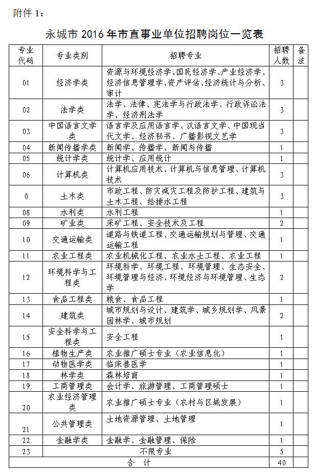 附件1: 永城市2016年市直事業(yè)單位招聘崗位一覽表