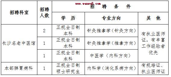 因我院長沙名老中醫(yī)館即將投入使用,還有部分科室需增補(bǔ)工作人員,經(jīng)醫(yī)院黨委會(huì)研究,決定面向社會(huì)招聘聘用制工作人員5人,現(xiàn)將有關(guān)事項(xiàng)公布如下: