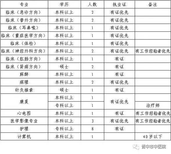 3、有工作經(jīng)驗(yàn)者:從事臨床醫(yī)療、影像專業(yè)三年以上的執(zhí)業(yè)醫(yī)師。除護(hù)理專業(yè)外,其他專業(yè)有工作經(jīng)驗(yàn)者優(yōu)先聘用。