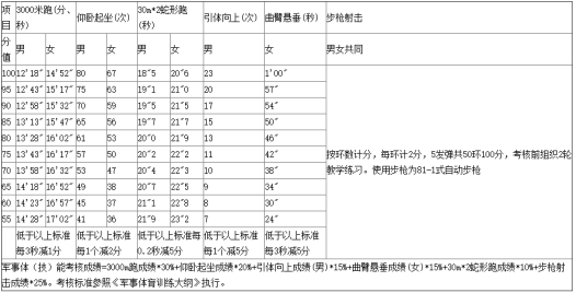 泰順縣人民武裝部工作人員崗位需進行軍事體(技)能考核,考核成績滿分為100分,考核項目及計分標準見下表(此項不收取考試費)。