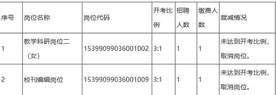 根據(jù)《云南省事業(yè)單位公開招聘工作人員辦法》(云人社發(fā)〔2016〕182號)等有關(guān)文件規(guī)定及《中共云南省委黨校(云南行政學(xué)院)2022年事業(yè)單位公開招聘工作人員公告》要求,截至2022年4月26日24時報名繳費結(jié)束,我單位按照各招聘崗位繳費人數(shù)與計劃招聘人數(shù)比例應(yīng)等于或大于3:1方能開考的原則,未達(dá)到3:1的,裁減相應(yīng)招聘崗位。結(jié)合此次各崗位實際報名繳費情況,現(xiàn)將崗位裁減情況公告如下: