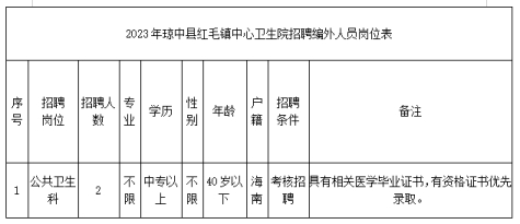 具體崗位、招聘人數(shù)及招聘條件詳見《2023年瓊中縣紅毛鎮(zhèn)中心衛(wèi)生院招聘編外人員崗位表》。