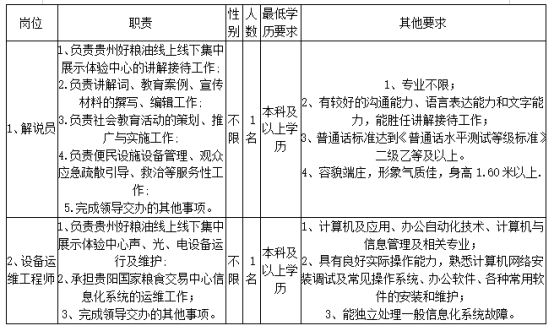 貴陽國家糧食交易中心,是省委編辦批示成立的正縣級公益一類事業(yè)單位,由貴州省糧食和物資儲備局直屬管理。主要職能是:按照“公開、公平、公正、誠信”的原則組織政策性糧食競價交易相關工作,完成貴州省糧食和物資儲備局交辦的其它工作。根據工作需要,現以人才派遣的方式招聘工作人員: