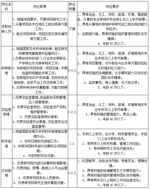 中南大學(xué)資源循環(huán)研究院依托學(xué)校有色金屬重點(diǎn)學(xué)科群組建而成,致力于有色金屬資源循環(huán)、清潔冶金及環(huán)境材料制備的基礎(chǔ)研究和技術(shù)開發(fā)應(yīng)用,擁有先進(jìn)的分析檢測、科學(xué)研究條件,是一個(gè)集人才培養(yǎng)、科學(xué)研究、工程應(yīng)用與社會(huì)服務(wù)于一體的綜合性研究機(jī)構(gòu)。研究院現(xiàn)有研究人員20余人,博士和碩士研究生60余人。因工作需要,現(xiàn)面向社會(huì)公開招聘非事業(yè)編制人員,現(xiàn)將有關(guān)招聘事宜公告如下: