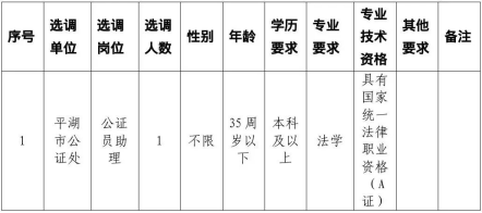 平湖市司法局下屬平湖市公證處事業(yè)單位工作人員1名,用編性質(zhì)為公益二類事業(yè)單位工作人員。