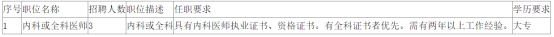 因中心發(fā)展的需要,經(jīng)上級部門批準,面向社會公開招聘內(nèi)科或全科醫(yī)師3名,具體要求如下: