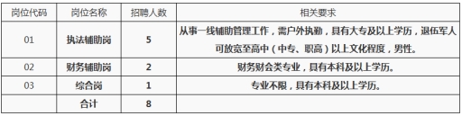 根據(jù)宿豫區(qū)城市管理工作實(shí)際需要,經(jīng)研究,決定面向社會(huì)公開招聘城市管理輔助工作人員8名,F(xiàn)將有關(guān)事項(xiàng)公告如下: