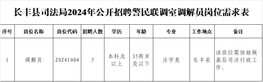 為進一步加強長豐縣社會矛盾糾紛調(diào)解隊伍建設,構建大調(diào)解的社會治理格局,經(jīng)研究決定,現(xiàn)委托合肥慧豐人才服務有限公司面向社會公開招聘警民聯(lián)調(diào)室調(diào)解員5名。有關事項公告如下:
