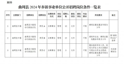 本次招聘崗位為曲周縣鄉(xiāng)鎮(zhèn)全額事業(yè)編制工作人員30名,其中,限“高校畢業(yè)生”報考崗位15名,定向招聘崗位3名。招聘人數(shù)、具體崗位、資格條件詳見《曲周縣2024年鄉(xiāng)鎮(zhèn)事業(yè)單位公開招聘崗位條件一覽表》。