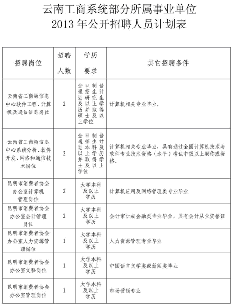 詳見《云南工商系統(tǒng)部分所屬事業(yè)單位2013年公開招聘人員計劃表》