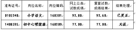 2016年7月4-5日為試教成績(jī)復(fù)查時(shí)間,共有2名考生要求復(fù)查,結(jié)果及處理如下: