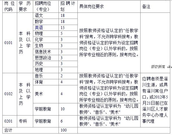 招聘崗位(專業(yè))及有關(guān)具體要求,詳見《2012年淄川區(qū)教體系統(tǒng)事業(yè)單位公開招聘教師計劃表》(附件)。