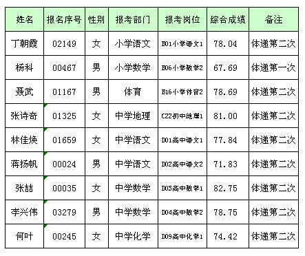 在體檢環(huán)節(jié)中,有考生放棄體檢資格,根據(jù)招聘公告規(guī)定,體檢棄權(quán),則從同一崗位中按總成績(jī)從高分到低分依次遞補(bǔ)(同一崗位遞補(bǔ)不超過兩次),F(xiàn)將同一崗位第二次遞補(bǔ)名單公示如下(見附表)。