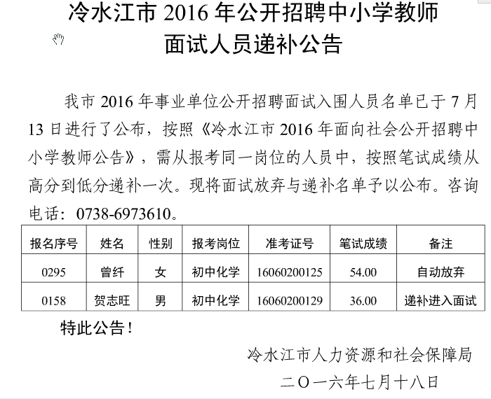 2016年湖南省冷水江市教師招聘面試人員遞補(bǔ)公告