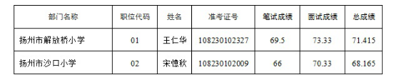 根據(jù)《揚(yáng)州市廣陵區(qū)教育局所屬事業(yè)單位2016年公開招聘教師崗位工作人員簡(jiǎn)章》,因揚(yáng)州市解放橋小學(xué)01職位、揚(yáng)州市沙口小學(xué)02職位進(jìn)入考察環(huán)節(jié)的考生自愿放棄,現(xiàn)按上述崗位考生考試總成績(jī)從高分到低分依次遞補(bǔ),名單如下: