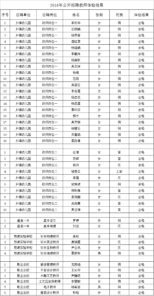 2016年湖南省懷化市通道侗族自治縣教師招聘體檢結(jié)果