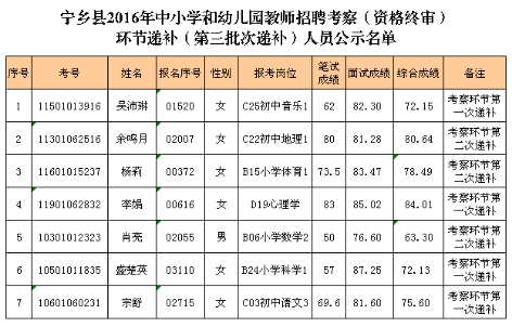 在考察(資格終審)環(huán)節(jié)中有7名考察對(duì)象放棄考察(資格終審)資格,根據(jù)招聘公告規(guī)定,棄權(quán)者,則從同一崗位中按總成績(jī)從高分到低分依次遞補(bǔ)(同一崗位遞補(bǔ)不超過兩次)。現(xiàn)將遞補(bǔ)名單公示如下(見附表)。