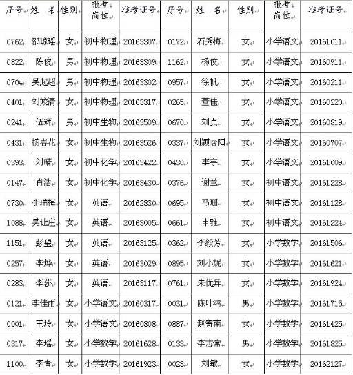 根據(jù)《2016年婁底市婁星區(qū)公開招聘農村中小學教師實施方案》的規(guī)定,經(jīng)過對體檢合格人員的政審考核,現(xiàn)將擬聘用人員的名單予以公示,公示期為7個工作日,從公示當天算起: