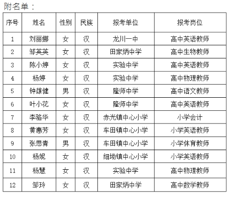 根據(jù)《廣東省事業(yè)單位公開(kāi)招聘人員辦法》和《2016年龍川縣赴華南師范大學(xué)招聘高中教師公告》、《2016年龍川縣第二批公開(kāi)招聘教師公告》,經(jīng)過(guò)報(bào)名、資格審查、筆試、面試、體檢以及考察程序,確定劉麗娜等12人為擬聘用人員,現(xiàn)予以公示。