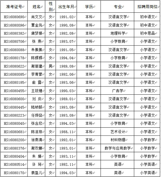 海曙區(qū)教育局2016學(xué)年公開(kāi)招聘第三批事業(yè)編制人員第一批考察工作已于近日結(jié)束,根據(jù)《寧波市海曙區(qū)教育局公開(kāi)招聘2016學(xué)年第三批事業(yè)編制人員簡(jiǎn)章》規(guī)定,現(xiàn)將第一批擬聘用人員名單予以公布。