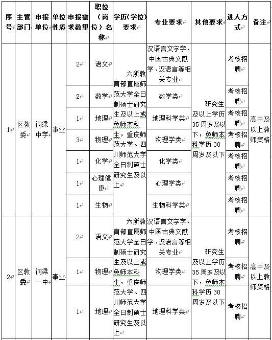 銅梁中學(xué)(11名):語文2名、數(shù)學(xué)2名、地理1名、物理3名、化學(xué)1名、生物1名、心理健康1名;